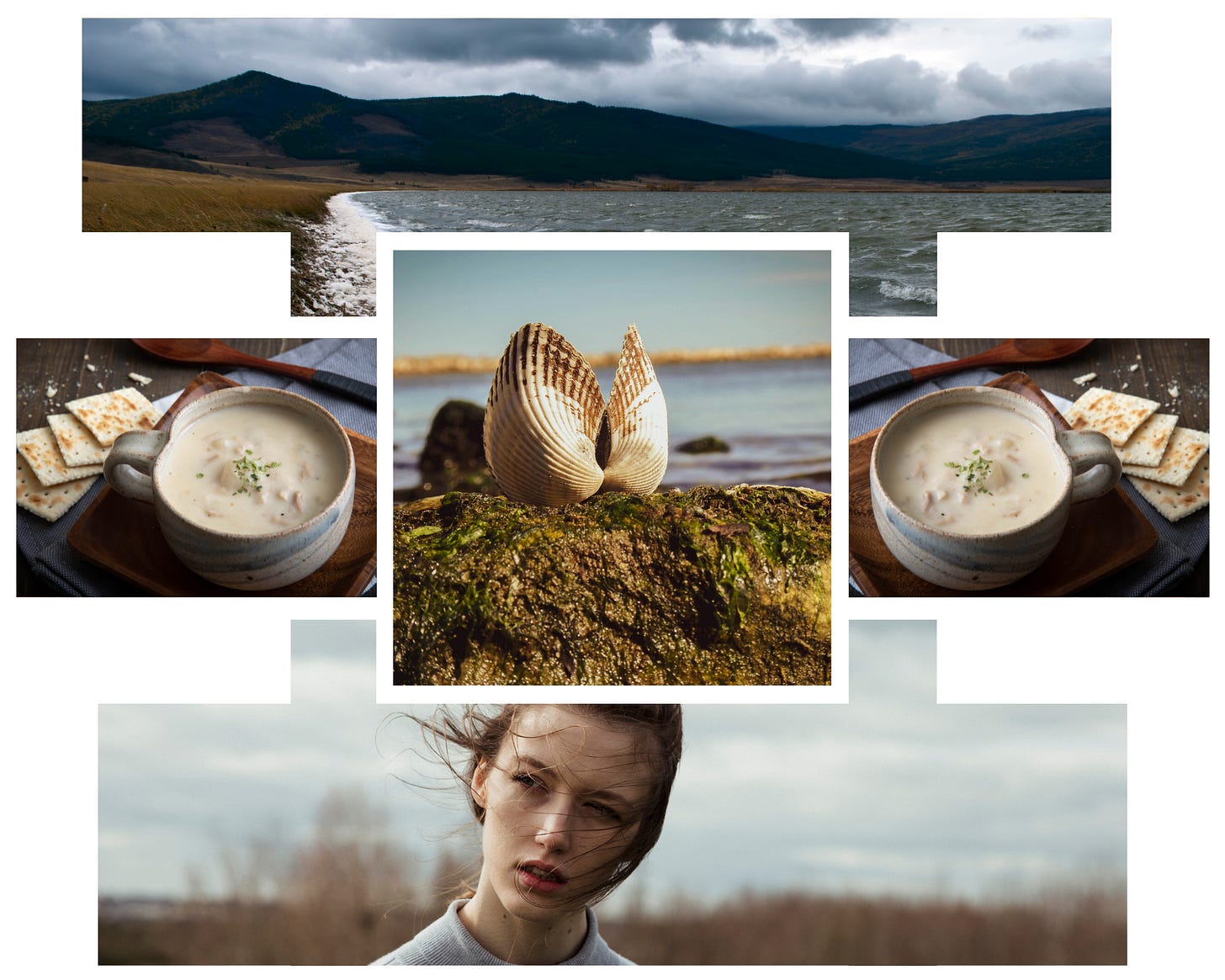 We sat in the sun, cold wind cutting through our sweaters like knives, whipping our hair around our faces. Eating hot clam chowder with plastic spoons from paper cups, we imagined it was all balancing out, that somehow, Cold wind versus hot soup equals a comfortable neutral state. We split a mini baguette with our hands and drank cold bottled drinks. Surely that was the unbalancing element that left my chest cold. I felt as though I was topless.