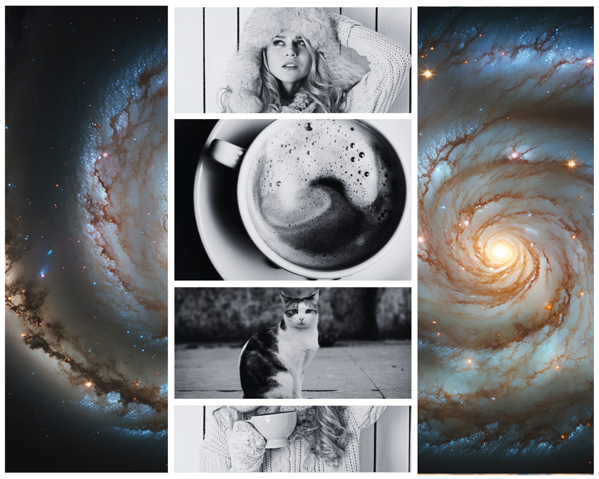 Along the periphery, kittens play and explore. They are distant planets in chaotic orbits. It’s cold. Whenever I think this, I remind myself that it isn’t snowing, that this is California, that the cold doesn’t come close to threatening one’s existence the way it does in other environments. Nevertheless, I’m wearing a hat, scarf, and jacket as I sit at the counter drinking my coffee, staring at the cat, drifting through the deep darkness of space in our whirring, humming spaceship…