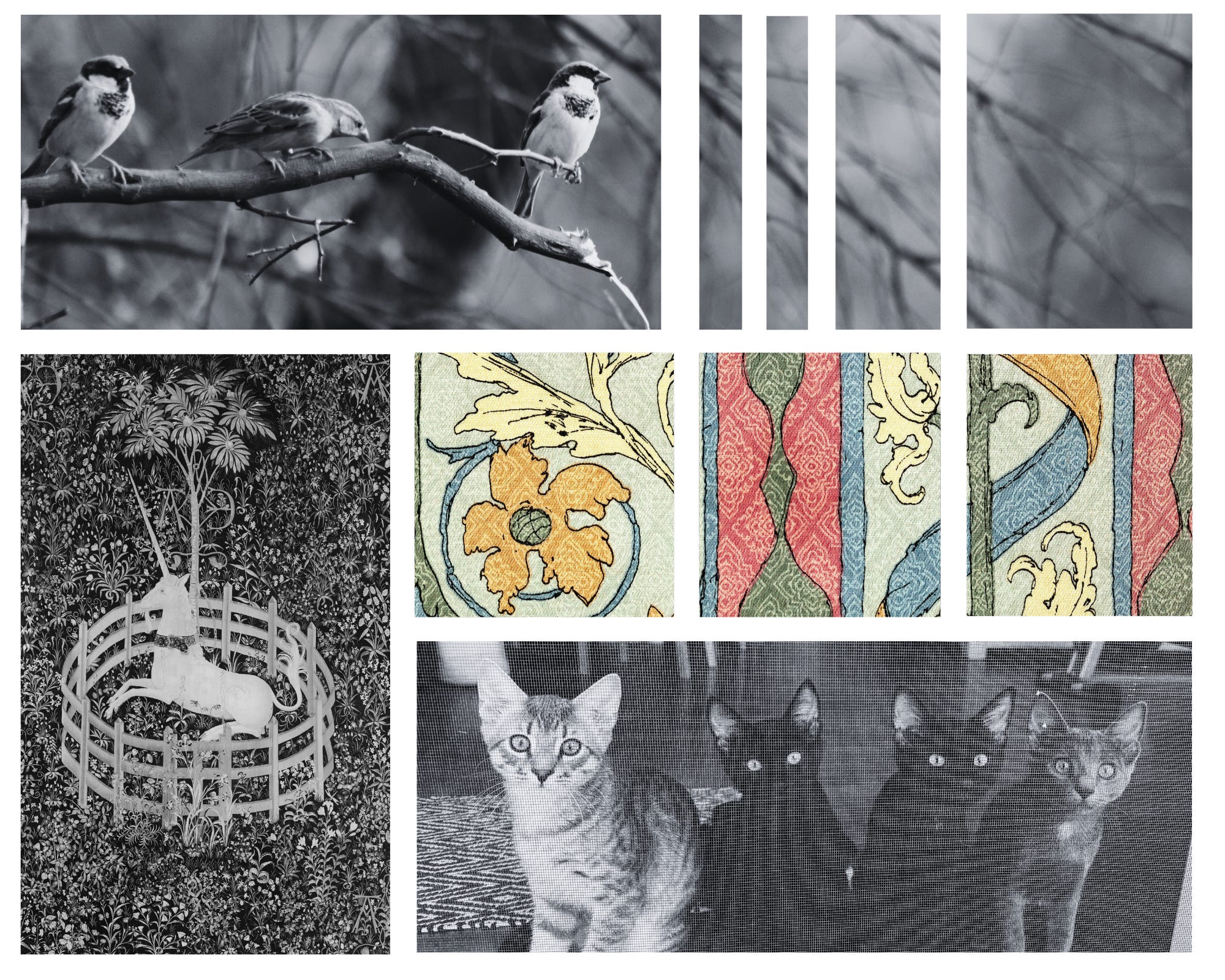 Birds sweep through the garden. Small chirping birds. In the thicket of sage, on branches of rose, under grape leaves, on spent pumpkin vines. Hopping, they advance. A gentle wave, singular birds, a flock. They sing a song without melody. All else falls silent and still in the cool predawn. I sit with mug in hand. Three kittens huddle close together, watching through the screen.