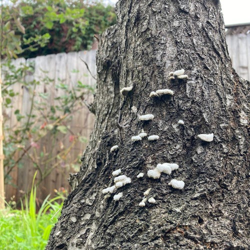 Your little slice of suburbia is a foreign land, you, an alien musing on possible futures, a supposed past, that thing some person said. A career change, a new pair of shoes, a vacation someday, how to lose the weight, how to gain the money, that show you binge-watched deep into the night, that’s where you dwell. Around you, strawberry berries fall from a tree onto the sidewalk and stick to your shoes. Small white fungi ascend a stump, like fairy steps. Sap drips lusciously from the bark of a pine capturing sunlight in frozen amber droplets.